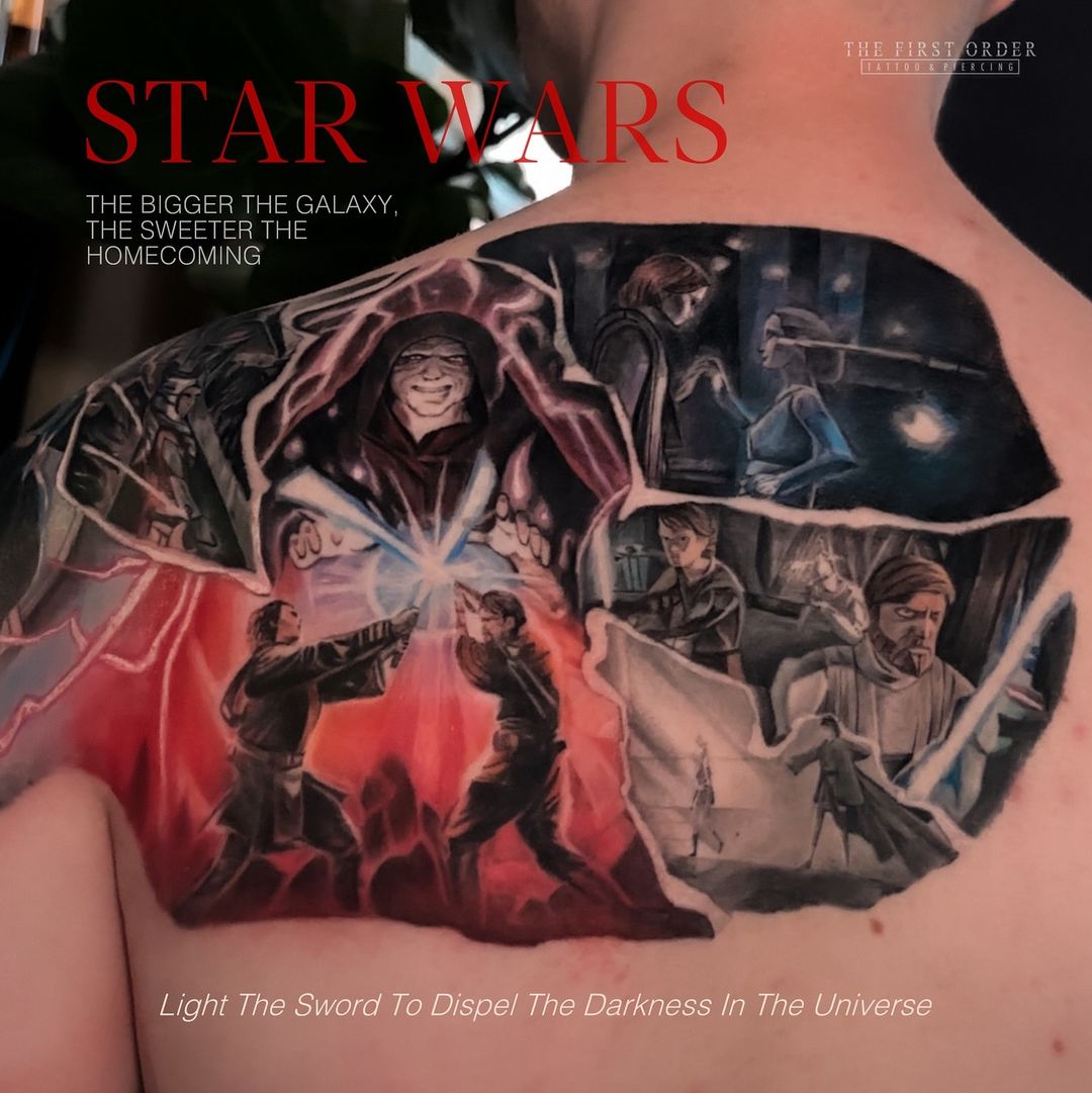 As each day passes, the galaxy is gradually "printed" on the body of the customer, each stroke of ink is like an oath of allegiance to the Star Wars universe. The First Order must admit that, although the right profession is tattooing, this tattoo makes us feel like we are directly participating in the production of Star Wars. From the Millennium Falcon to the lightsaber, from space battles to distant planets, everything is recreated in a surreal way. Or the powerful Darth Vader to the wise Yoda, everything seems to come alive on the skin. We bet that if someone asks about a certain scene in Star Wars, our customer can point to himself and tell us in detail! Thank you for trusting and choosing 57 Au Co to create a unique work of art together!